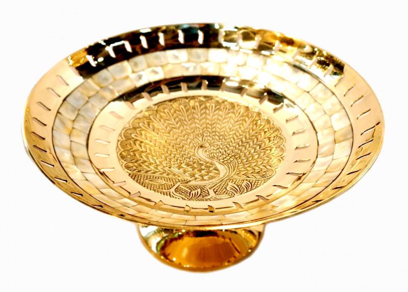 Конфетница 1 ярус Shell желтый металл Размер: 26,5*26,5*13,5 см Посуды из латуни - яркая, нарядная и праздничная. Глядя на такую посуду, представляешь красавицу Шахерезаду, которая своими тонкими изящными пальчиками берет кусочек рахат-лукума с блюда, украшенного перламутром; из чайника с длинным носиком наливает освежающий напиток в бокал, украшенный изображениями павлинов и райских птиц, а в латунной вазе благоухают только что сорванные роскошные заморские цветы… Тонкий звук латунного колокольчика сообщает слугам о том, что пора зажечь свечи в латунных подсвечниках.... И новая сказка, и новое волшебство, и еще одна восточная ночь… Одним словом, хочешь восточную сказку- покупай посуду из латуни.