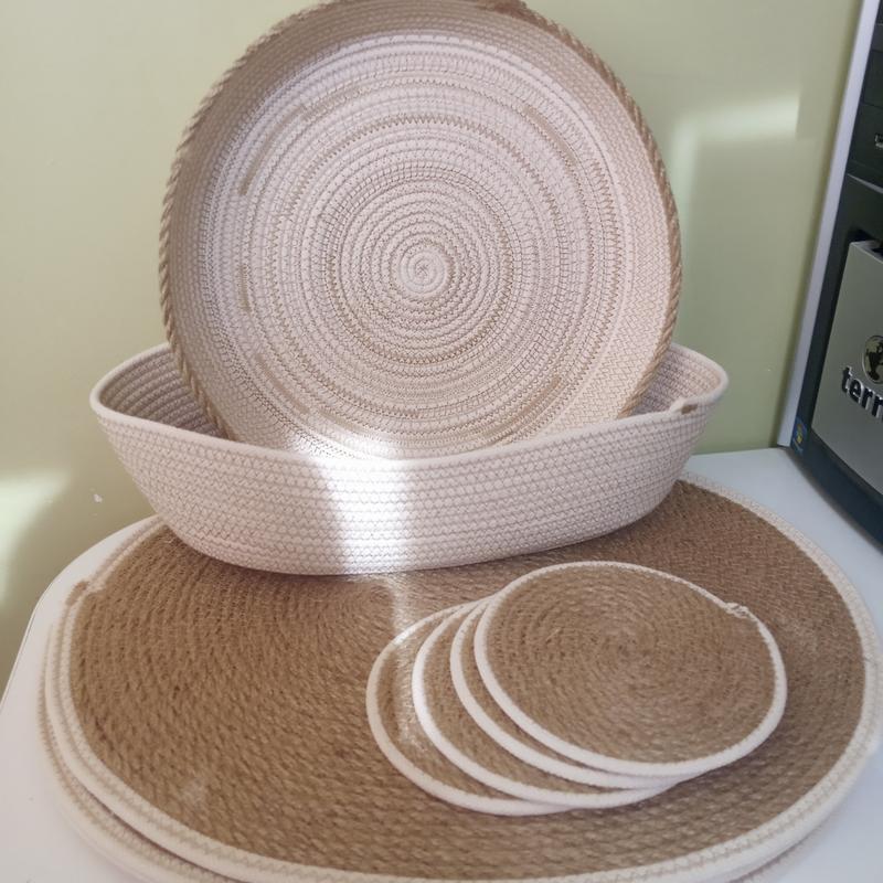 Виконано з екологічних матеріалів * Джут 100% Бавовна 100% На 4 персони, плейсмати, підстаканники, лодочка для хлібу, корзинка для фруктів Довговічні, тримають форму, можуть бути як підставка під гаряче Кількість,форми, розміри і кольору обговорюються, може бути виконано на замовлення. Набором з любої кількість або поодиночно. Авторська ручна робота Ціна набору 1500 грн