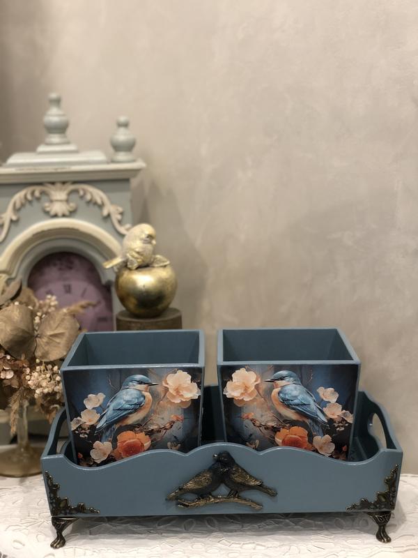 Набор:таца с коробульками. Размер подноса: длина 30 см, ширина 16 см,высота без ножек 6 см. Размер коробов:ширина по верху 11,5 см,высота 12,2 см. Ручная работа.
