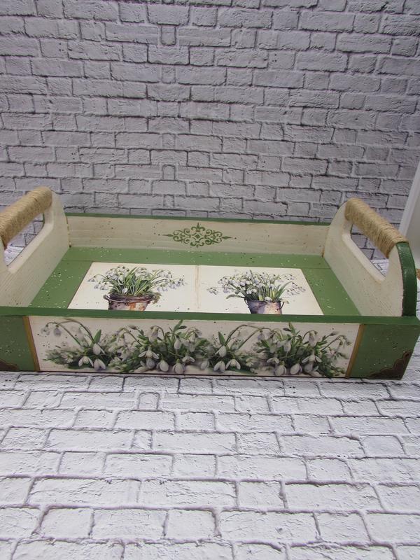 Дерев′яна таця з двома плиточками. Декорована таця в техніці вживлення, трафаретний розпис, пристарена, невеликий набризг. Ручки таці оброблені натуральним шпагатом. Таця прикрашена металевими шильдами та металевими куточками. Така таця буде приємним і незвичайним подарунком на будь-яке свято. Матеріал:сосна. Розмір 28,5х18,5х4,5 см