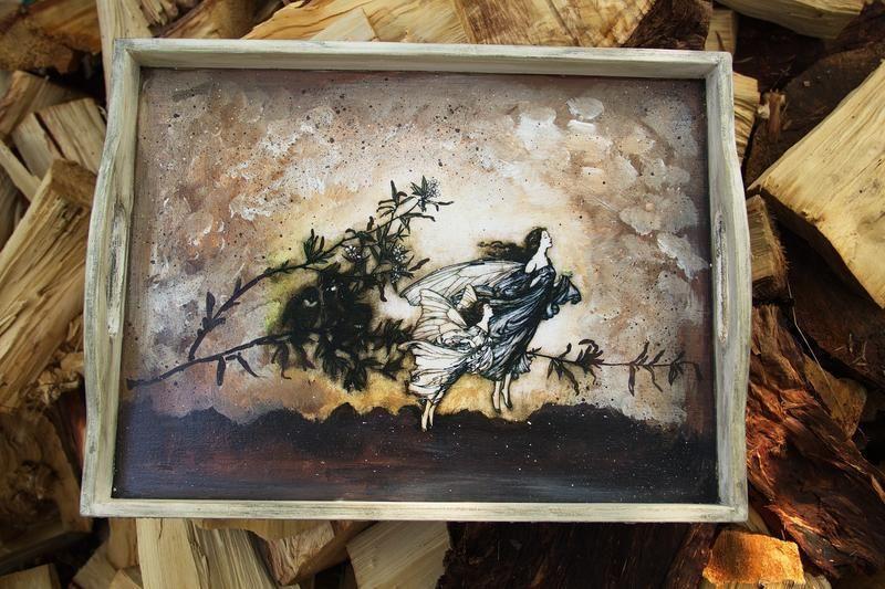 Поднос для завтрака в постель выполнен в технике декупаж с элементами художественной росписи. Немного потёртостей. Всё это придаёт подносу значимости и интересной истории. Поднос в промежутках между делом, может стоять и украшать Вашу кухню или гостиную, согреет Ваш интерьер , оживит его. Такой поднос не нужно прятать в шкаф. Кроме того такой замечательный памятный подарок. Вещь нужная и практичная при этом нарядная и необычная. Придайте настроения своему окружению, удивите знакомы таким подарком.