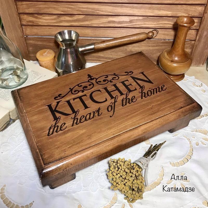 Деревянный поднос-подставка из сосны. Основательный, толстый, на крепких ножках. В декоре использовала тонирование и вживление с элементами состаривания: потёртости и набрызг. Это придало подставке уютный и душевный облик. Надпись на английском языке гласит о том, что кухня- сердце дома. И это истинная правда для большинства семей! Размер подноса 20*30 см. Оптимальный размер для красивой подачи утреннего кофе. Красота и уют в кухне- то, к чему стремится любая хозяйка. И я думаю, что приобретение такой подставки поможет вам в этом.