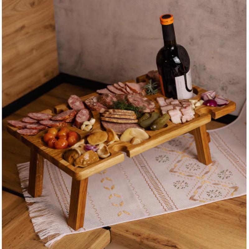 Дубовий винний столик – це стильний та практичний аксесуар для справжніх цінителів комфорту. Завдяки натуральному дубу він має привабливий вигляд, демонструючи благородну текстуру та теплі відтінки деревини. Його універсальний дизайн дозволяє використовувати столик не лише вдома, а й на пікніку. Столик має 6 секцій для закусок, завдяки чому можна продати різні варіанти подачі. Також є 4 виїмки для келихів та отвір для пляшки, що забезпечує простоту сервірування та стійкість навіть на нерівних поверхнях. Винний столик має складані ніжки, додатково укріплені меблевою фурнітурою. Завдяки цьому він ідеально підходить для транспортування та зберігання. Виріб виготовлений з натурального дуба, всі елементи конструкції ретельно зашліфовані та покриті олією. Такий столик стане чудовим подарунком для друзів, колег чи близьких. Він виглядає стильно та сучасно, але водночас зберігає нотки традиційного затишку. Ідеальний вибір для створення атмосферних моментів у вашому домі. Характеристики: Матеріал: Дуб Розміри: 50*30 см Висота: 18 см