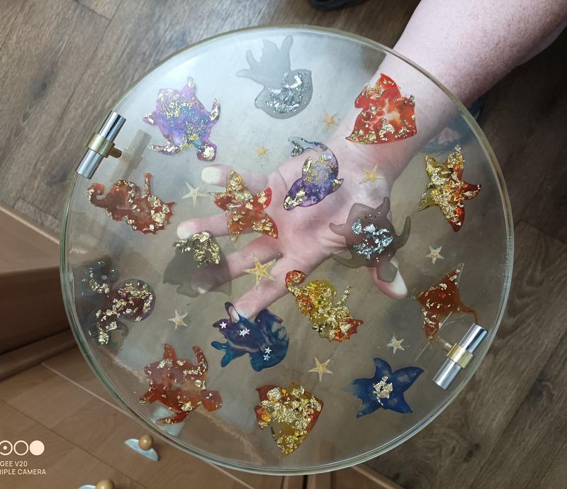 Круглый прозрачный поднос из эпоксидной смолы, украшенный декоративными ракушками, звездами, блестками и поталью. Оригинальный дизайн в морском стиле. Изделие создано вручную, в едином экземпляре. Подойдет для сервировки, как декор или стильный подарок. Характеристики: – Диаметр: 35 см – Міцна епоксидна смола – Металлические ручки – Стойкий к влаге – Легкий в уходе