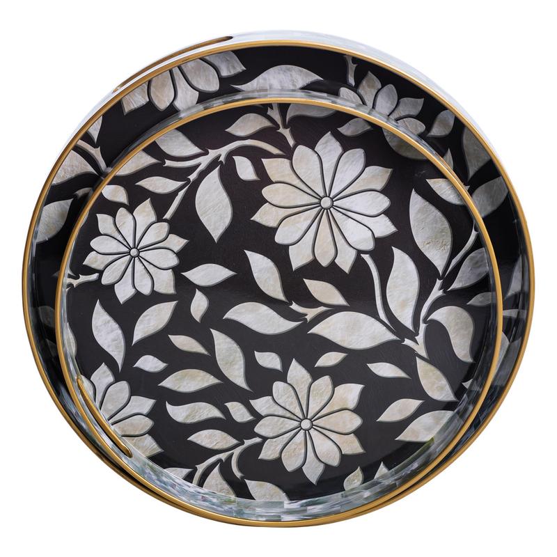 Набор подносов -- изящное и практичное решение для дома. Они выполнены из прочного пластика и украшены цветочным орнаментом. Глянцевая поверхность и аккуратная окантовка придают изделиям элегантный вид. Основные характеристики набора подносов для сервировки Диаметр: 32.5 / 37 см; Высота: 4 см; Глубина: 2.5 см; Материал: пластик. Такой набор подносов станет практичным и элегантным дополнением к вашему дому. Он одинаково уместен для повседневного использования и для особых случаев -- будь то подача напитков, десертов или оформление праздничного стола. Стильный орнамент и благородные оттенки придают подносам утончённый вид, а их универсальный дизайн легко впишется в любой интерьер, добавляя нотку уюта и гармонии.