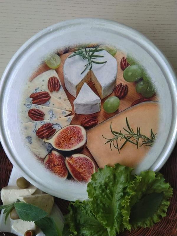 Кухонная досточка для подачи различного вида нарезки, декорирована в стиле декупаж. Обратная сторона рабочая, пропитана льняным маслом. Размер: диаметр-18см, толщина-2,5см.