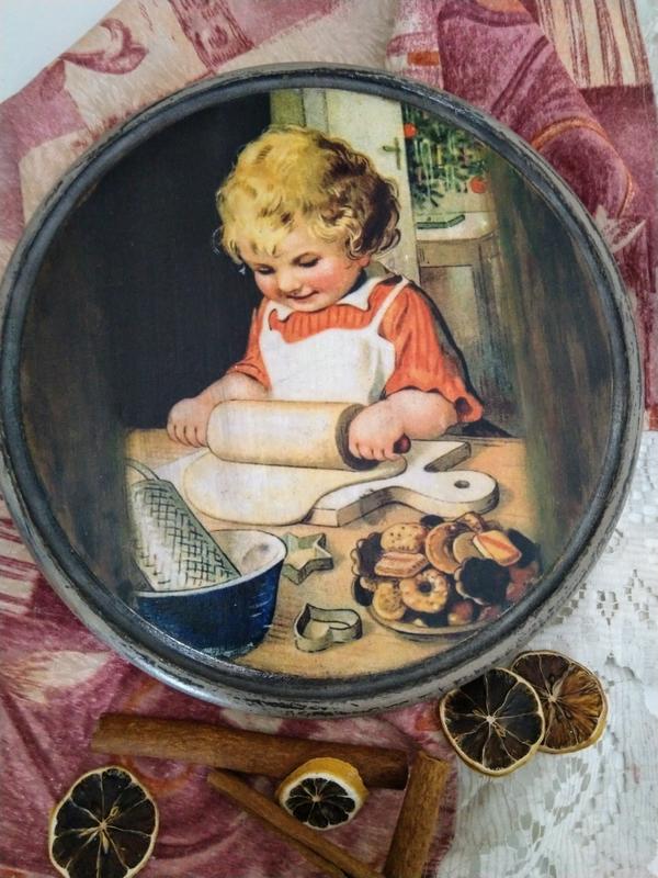 Кухонная досточка для подачи различного вида нарезки, а так же сладостей; сделана в технике декупаж. Материал-дерево, бук. Обратная сторона рабочая. Диаметр 26см.