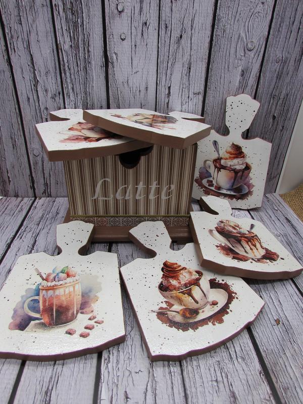 У комплект входить: 6 підставок з двостороннім декором, короб для зберігання підставок. Короб має 4 дерев′яних ніжки, прикрашений трафаретним розписом. Комплект декорований в техніці декупаж, імплантацією зображення. При декоруванні використовувалися матеріали на водній основі, не шкідливі для здоров′я. Материал:ольха. Розмір короб- 17,5х12,5х1 см,підставки-15,5х12х1 см