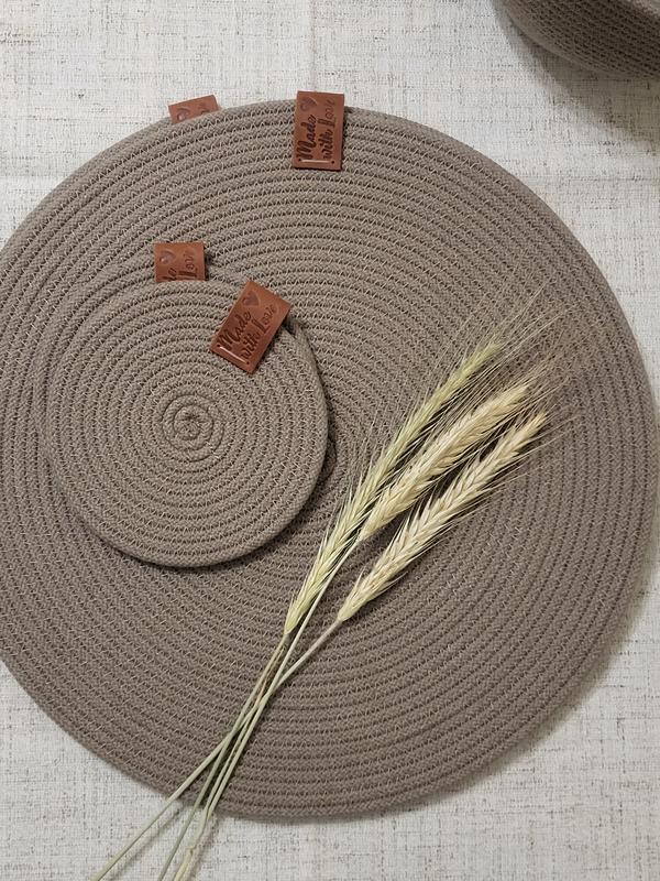 Подставка под тарелки в d30 см и подставка под чашку в d12см из 100% хлопкового шнура в цвете мокачино отделаны кожаными бирками. Набор на две персоны