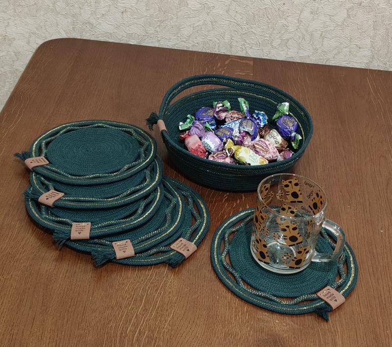 Набор подставок под чашки ( 6 шт) + корзина для сладостей, вышитые люрексными нитями. Изготовлено из хлопкового шнура 5 мм. Подставки защищают Ваш стол от царапин и воздействия горячих температур.