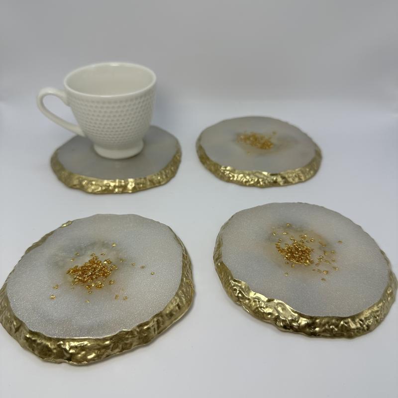 Handmade У роботі використані матеріали: епоксидна смола, сяючі блискітки, камінці, поталь, силіконові обмежувачі проти ковзання. Розмір: діаметр 10.5 см. Епоксидна смола має високу міцкість і довговічність. Підставки стануть вишуканою прикрасою Вашого столика! Чудова ідея на подарунок! Набір- 4 шт.