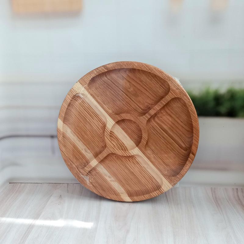 Менажниця дерев'яна 30 см, кругла, на 4 секції + соус, ДУБ Менажниця з натурального дерева на 4 відділи стане крутою прикрасою для вашого столу! Здивуйте своїх гостей подачею страв. Деревʼяні стінки менажниці досить товсті, а отже гарячі страви не пектимуть руки та не нагріватимуть покриття столу. Посуд зроблений з натурального дерева, дуже приємний на дотик і має приємний запах. Наш посуд з дерева - екологічний та натуральний. Дерев'яна менажниця - це маленька приємність для себе і хороший подарунок для близьких. Одна порційна страва, поділена всередині на кілька осередків, дозволяє покласти в одну тарілку різну їжу, не змішуючи її між собою. Таку тарілку можна використовувати для м'ясних та рибних страв. Ідеально підійде для подачі овочів та фруктів. Ця тарілка буде стильно та елегантно виглядати на святковому столі, а також радуватиме Вас у щоденному використанні. СПОСІБ ДОГЛЯДУ: мити під проточною холодною водою, витирати насухо після кожного використання . Час від часу змащувати соняшниковою олією, після чого дати ввібратися. Не використовувати в посудомийній машині, мікрохвильовій печі та духовці