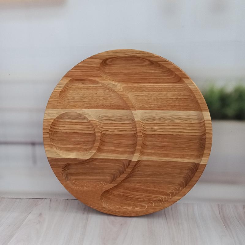 Менажниця дерев'яна Місяць 30 см, кругла, на 2 секції + соус, ДУБ Менажниця з натурального дерева на 3 відділи стане крутою прикрасою для вашого столу! Здивуйте своїх гостей подачею страв. Деревʼяні стінки менажниці досить товсті, а отже гарячі страви не пектимуть руки та не нагріватимуть покриття столу. Посуд зроблений з натурального дерева, дуже приємний на дотик і має приємний запах. Наш посуд з дерева - екологічний та натуральний. Дерев'яна менажниця - це маленька приємність для себе і хороший подарунок для близьких. Одна порційна страва, поділена всередині на кілька осередків, дозволяє покласти в одну тарілку різну їжу, не змішуючи її між собою. Таку тарілку можна використовувати для м'ясних та рибних страв. Ідеально підійде для подачі овочів та фруктів. Ця тарілка буде стильно та елегантно виглядати на святковому столі, а також радуватиме Вас у щоденному використанні. СПОСІБ ДОГЛЯДУ: мити під проточною холодною водою, витирати насухо після кожного використання . Час від часу змащувати соняшниковою олією, після чого дати ввібратися. Не використовувати в посудомийній машині, мікрохвильовій печі та духовці