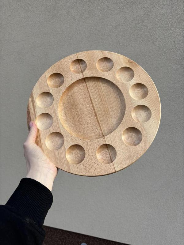 Менажниця дерев'яна 30 см, Великодня, БУК Розмір 30 см. Матеріал - бук! Покрита олією ▪️Завжди будуть в нагоді для сервірування ваших улюблених закусок🧀🥓 ▪️Стильні та зручні, виготовлені із натуральної деревини 🌳 Великодня тарілка-підставка для пасочки та крашанок, виготовлена з натурального дерева. Діаметр тарілки 30 см. Товщина 2 см. Виїмка для паски до 14 см. Тарілка покрита спеціальною професійною олією для виробів, що контактують з їжею. Виріб можна мити, він безпечний і екологічний. Мити еко-засобами або протирати вологою серветкою Не мити в посудомийній машині Не нагрівати в мікрхвильовці Не заливити окропом Не сушити на батареї