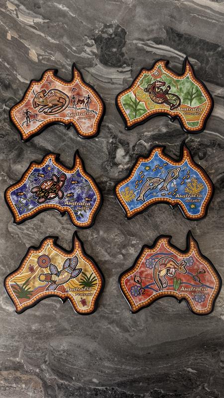 Набір з шести сувенірних костерів у формі Австралії з малюнками тварин на корковій основі. Нові не користовані, тілько немає кришки від коробки