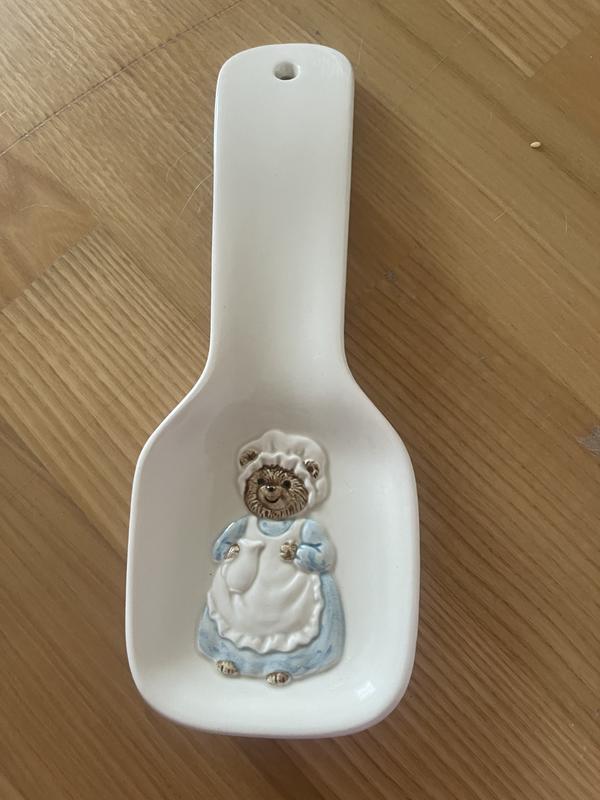 Цей предмет кухонного начиння слугує місцем для розміщення ложок та іншого кухонного приладдя під час готування, запобігаючи потраплянню рідин на стільниці. На підставці зображено рельєфну фігурку ведмедика в одязі. Подібні вироби часто імпортувалися компанією Otagiri Mercantile Company (OMC), яка діяла з 1954 року і спеціалізувалася на імпорті порцелянових та кам'яних виробів з Японії.