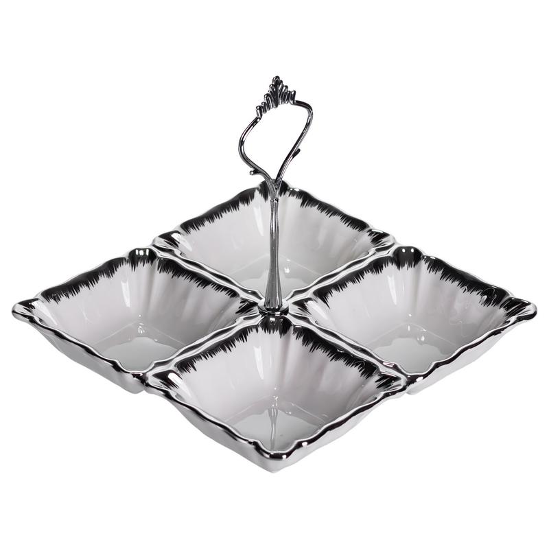Менажница фарфоровая на 4 секции для закусок 18×18×3 (см) с ручкой белый с серебром lc-byl...