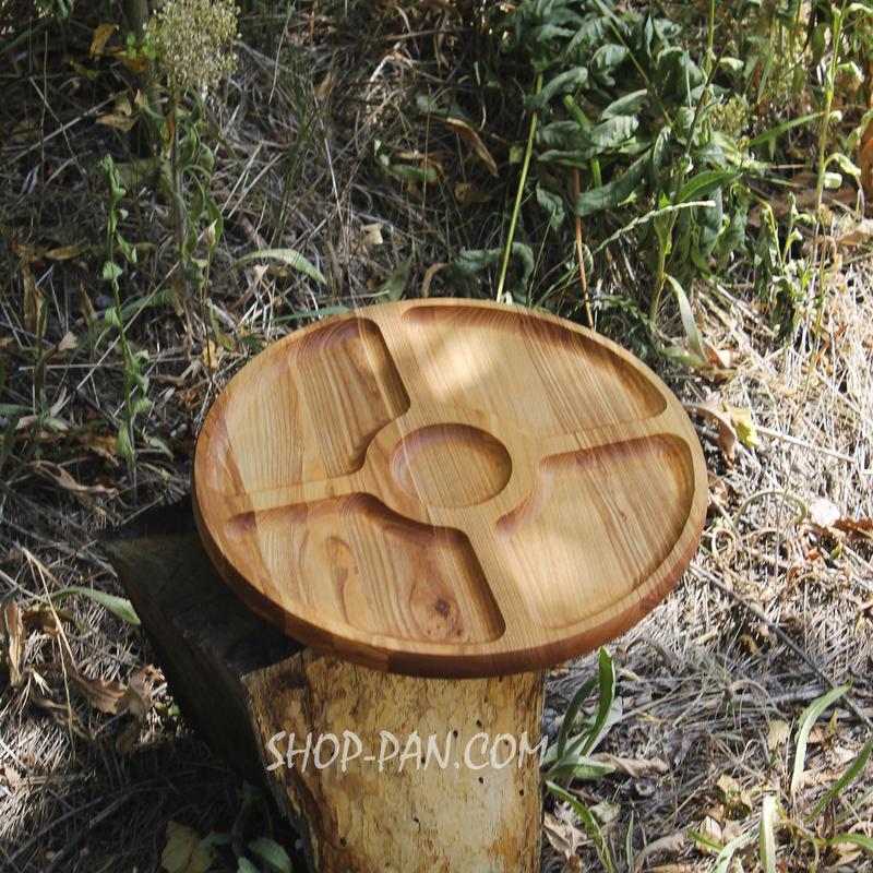 Двостороння кругла менажниця з дерева 35 см на 5 секцій Посуд зроблений з натурального дерева, дуже приємний на дотик і має приємний запах. Наш посуд з дерева - екологічний та натуральний. Дерев'яна менажниця - це маленька приємність для себе і хороший подарунок для близьких. Одна порційна страва, поділена всередині на кілька осередків, дозволяє покласти в одну тарілку різну їжу, не змішуючи її між собою. Таку тарілку можна використовувати для м'ясних та рибних страв. Ідеально підійде для подачі овочів та фруктів. Ця тарілка буде стильно та елегантно виглядати на святковому столі, а також радуватиме Вас у щоденному використанні.