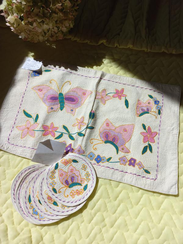Современный очень нежный комплект из салфетки и 6 костеров/ подставок под горячие чашки. Ручная вышивка. Салфетка и костеры новые, с брицами. 🌸Серветка. Размер 42 х 26 см. Требует стирки. Есть маленькие пятнышки. Поскольку есть бирка, то я не стирала. 🌸Костери. Диаметр 10 см.