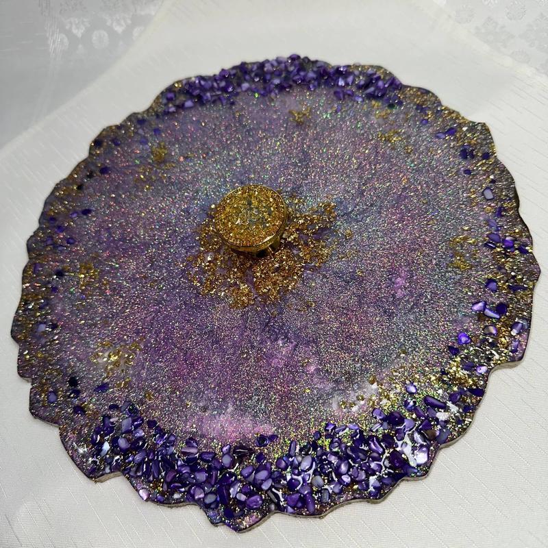 Handmade В работе использованы материалы: эпоксидная смола, перламутровый пигмент, глиттер, камушки, ручка для декупажа (стекло), силиконовые ограничители против скольжения. Размер: диаметр 25 см. Эпоксидная смола обладает высокой прочностью и долговечностью. Подставка станет изысканным украшением Вашего столика! Уникальная подставка из эпоксидной смолы, дополнит Ваш интерьер, или станет подарком близкому человеку!