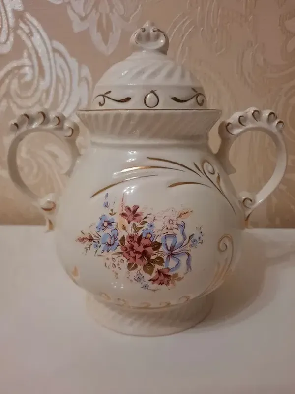 Большая, красивая сахарница. Рельефный фарфор. Состояние нового. Высота с крышечкой 17,5см. Ширина от ушка до ушка 18см. Краска, позолота - все на месте. Потертостей и сколов нет. Клеймо большой буквой "К" выдавлено в тесте.