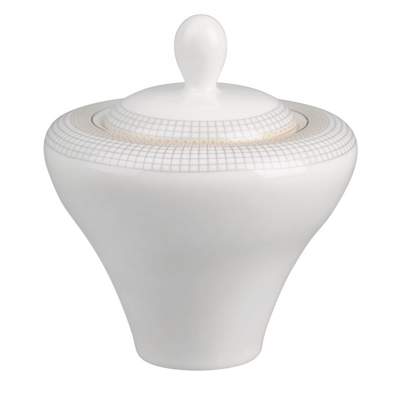 Порцелянова цукорниця. Порцеляна дуже міцна, що дозволяє робити вироби з цього матеріалу настільки тонкими, що вони навіть просвічуються на світлі. Якщо взяти фарфоровий виріб за краєчок і легенько стукнути його металевим предметом, наприклад ложкою, вийде дуже мелодійний звук, тональність якого залежатиме від товщини стінок виробу. Все це зробило порцеляновий посуд дуже популярним, проте до недавнього часу його могли собі дозволити лише найзаможніші люди. Ця цукорниця – майже правильної V-подібної форми. Вона вузька в нижній частині і плавно розширюється догори. У горлечка по обідку цукорниці проходить триколірний тонкий геометричний орнамент. Об'єм цукорниці становить 250 мл.