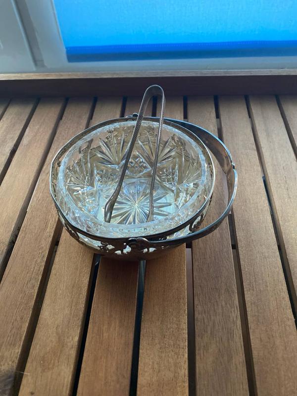 Винтажная сахарница, состоящая из внешнего корпуса, хрустальной вставки и щипцов. Материал вероятно альпака с посеребрением. На щипцах следующая маркировка: 18/8 90-2R. Кристальная вставка прилегает к неплотно, возможно не родная. Размеры. Внешний корпус: высота 5 см, высота с ручкой 12 см, диаметр 11 см. Вставка: высота 5 см, диаметр 10 см. Щипцы: длина - 11.5 см.
