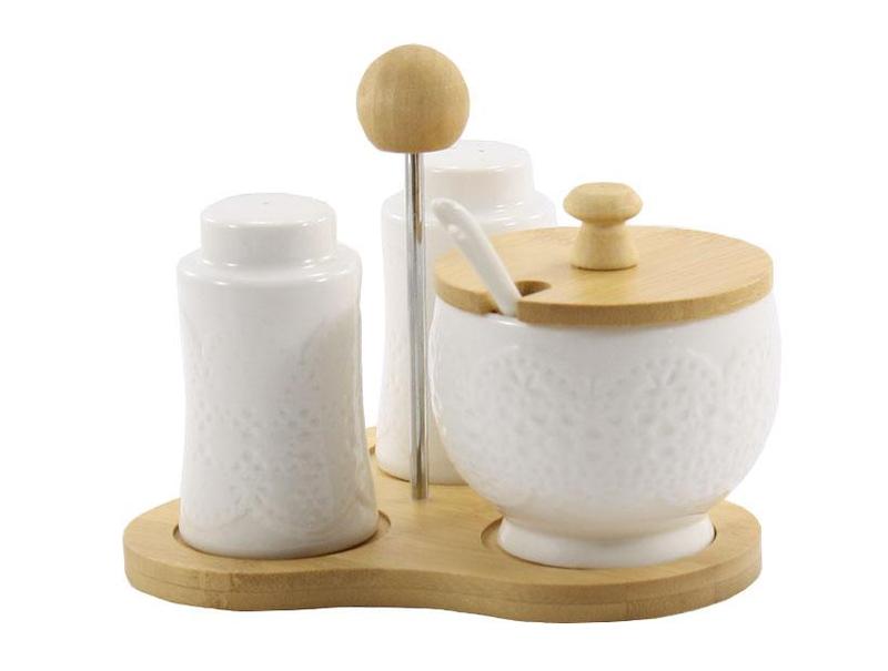 Набор посуды для сахара, соли и перца interos из 3 предметов на деревянной подставке белый...