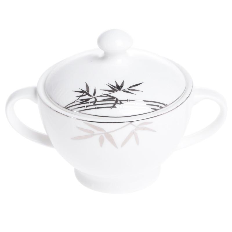 Цукорниця виготовлена з кістяної порцеляни, яка відрізняється особливою вишуканістю. Вироби з неї настільки тонкі, що можна побачити, як вони просвічуються. Цукорниця декорована оригінальним рослинним візерунком сріблястого кольору. Вона прикрасить кожен стіл і стане чудовим подарунком для ваших близьких. Ви можете купити цукорницю окремо або в комплекті з сервізом, в який також входять чайник, чашки з блюдцями, молочник.