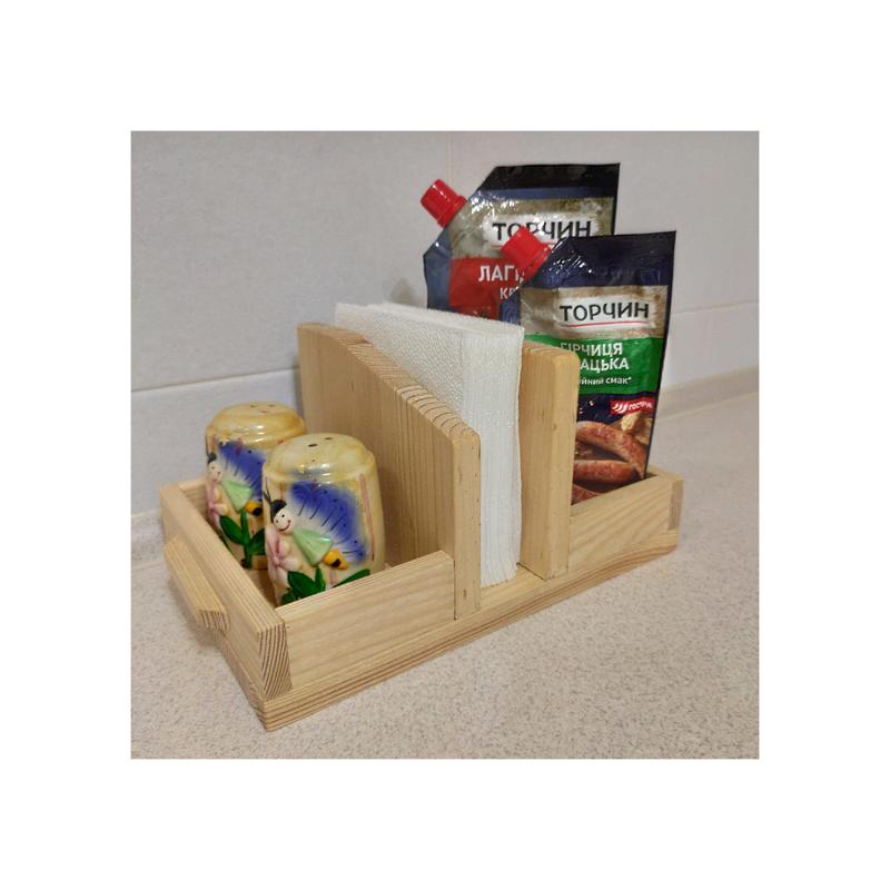 Цей дерев’яний кухонний органайзер складається з двох відділень для баночок зі спеціями або кетчупа та одного відділення для паперових серветок. Зроблений вручну з якісних матеріалів. Матеріал: сосна Загальні розміри: -довжина 24 см -ширина 15.5 см -висота 12.5 см Внутрішні розміри відділення для спецій: 13.5 х 7.5 х 3 см Внутрішні розміри відділення для серветок: 15.5 х 4 х 11 см Вага: 0.6 кг Виріб покритий натуральною лляною олією з бджолиним воском (колір можна вибрати), тому може використовуватись в якості предметів, що контактують з їжею. Підставка безпечна для людей, схильних до алергічних реакцій.
