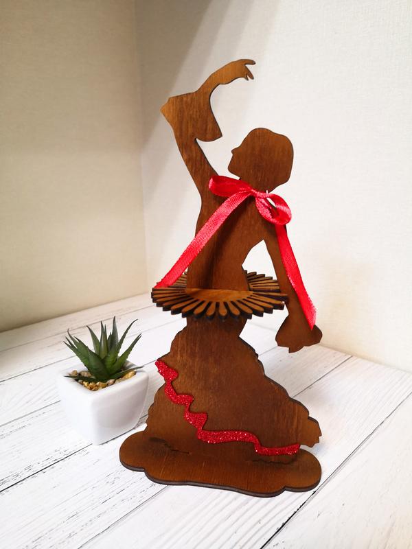 Салфетница изготовлена лазерной резкой из фанеры толщиной 4 мм и покрыта морилкой, низ платья декорирован глиттерным фоамираном. Такое экологически чистое изделие станет красивым украшением любого стола, ее можно использовать не только дома, но и в кафе, барах, ресторанах, пиццериях, на свадебных торжествах. Она станет отменным и недорогим подарком или сувениром для подруг, коллег, близких и родных на день Святого Валентина, 8 Марта, день рождения или другое торжество. Салфетки складываются треугольником и вставляются в прорези, помещается до 36 салфеток.