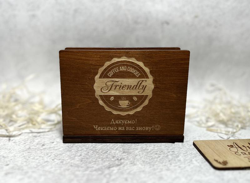 Деревянная салфетница для кофейки покрыта лаком под заказ с Вашим логотипом. Цвет "Тиковое дерево" (возможно другой). Размер салфетницы - 12х8,4 см. Гравировка двухсторонняя. Возможно изменение текста.