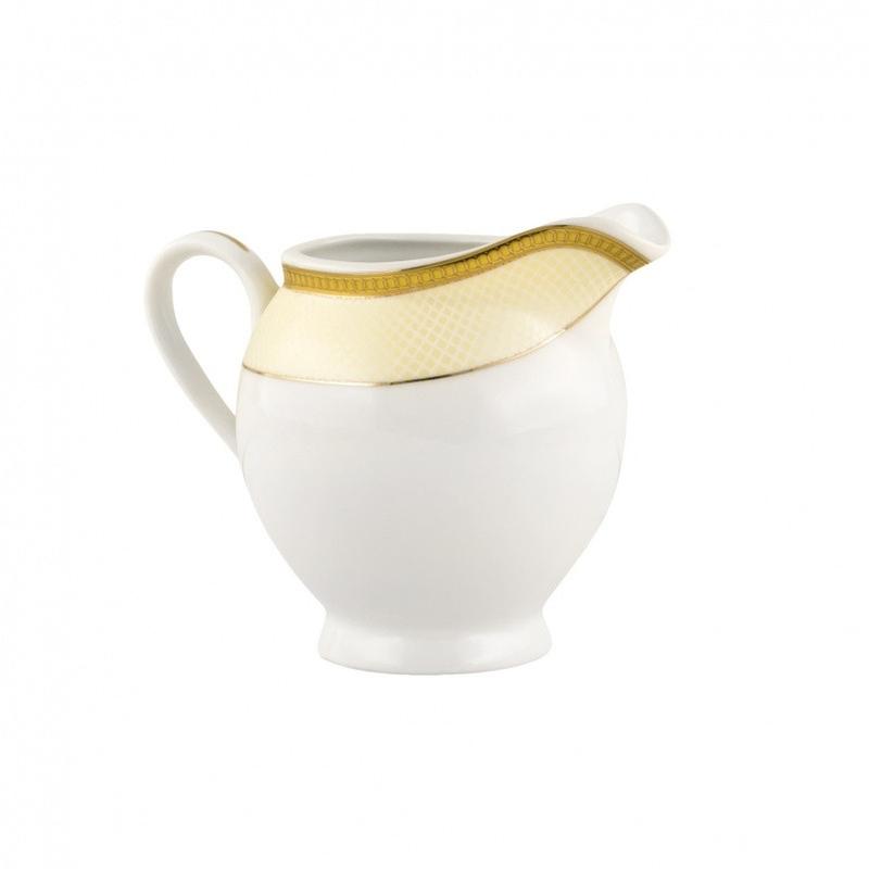 Молочник злегка нагадує давньогрецький посуд, а кольори підсилюють це враження. Золота облямівка органічно виглядає на білому тлі, а теплий ніжно- жовтий сонячний колір обрамлення вдало її підкреслює. Молочник, поряд з чайником і цукорницею, присутній на будь-якому чайному столі. Вважається, що чай молоком розбавляють англійці, але й у нас ця традиція стає досить популярною. Розбавляти молоком можна будь-який чай. крім зеленого і чорного з бергамотом чи іншими домішками. Молочник виготовлений з кістяної порцеляни. Її в Європі називали королівською або білим золотом. У Китаї, звідки вона родом, за благородну тонкість її називали «яєчною шкаралупою». Секрет виробництва оберігали як зіницю ока. Для кістяної порцеляни характерна особлива білосніжність, витончена тонкість і благородний звук при постукуванні. Тепер можна розкрити віковий секрет: всіма цими властивостями порцеляну наділяє кісткова зола тваринного походження. Завдяки натуральній сировині, вироби з кістяної порцеляни абсолютно безпечні для здоров'я.