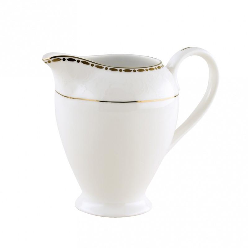 Молочник виконаний в стилі, близькому до англійських традицій: трохи витягнута форма, мінімум декору – золотиста облямівка зі скромними, ледве помітними графічними прикрасами. Молочник – постійний атрибут чайних сервізів, він потрібний для того, щоб кожен бажаючий міг розбавити чай молоком. Розбавляти молоком прийнято чорні індійські, цейлонські і китайські чаї. Не розбавляють молоком чай з бергамотом чи іншими добавками. Цей молочник виготовлений з кістяної порцеляни.