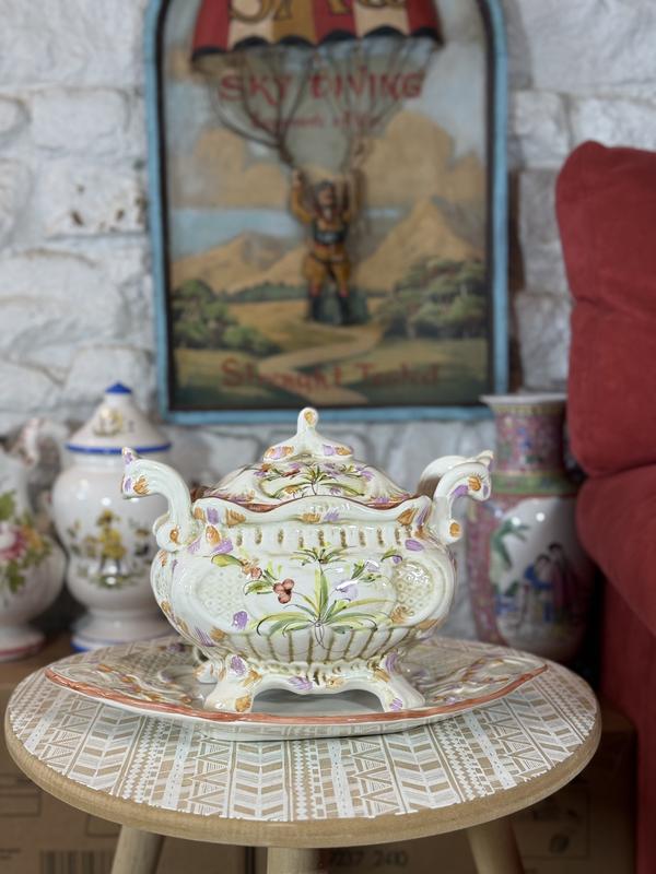 Ручний розпис із квітковими мотивами, типово італійський Baroque‑стиль. Помітні характерні кракелюри — ознака старої глазурованої майоліки. На дні є клеймо “Made in Italy” і “Cereria” - виріб з Bassano del Grappa або регіону Veneto. • Стан: видимі тонкі кракелюри — природній ефект старої кераміки. • Пошкодження: Приклеєний кінчик вушка на кришці • Походження - італія Вартість: 1640 грн