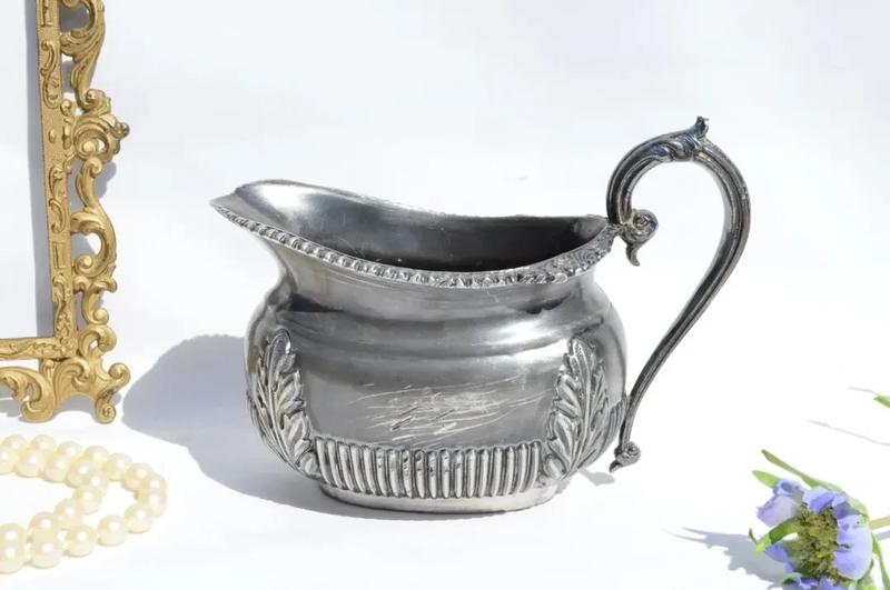 Антикварный молочник изысканной формы с рельефным орнаментом. Англия, начало XX века. Серебряное покрытие. Присутствуют царапины, последнее фото