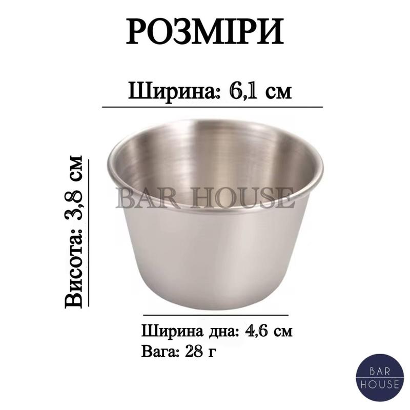 Соусник з нержавіючої сталі Bar House | Металевий стакан для соусів, дипів і заправок | Професійний, міцний, багаторазовий Соусник Bar House з нержавіючої сталі -- це практичне та універсальне рішення для подачі соусів, заправок і дипів, яке ідеально підходить як для домашнього використання, так і для професійної кухні. Лаконічний дизайн, міцна конструкція та харчова безпека роблять його незамінним аксесуаром у ресторанах, кафе, барах, закладах HoReCa та під час кейтерингу. Виріб виготовлений із харчової нержавіючої сталі, яка не іржавіє, не вступає в реакцію з продуктами та не впливає на їхній смак і аромат. Соусник легко витримує гарячі, холодні та кислі суміші, тому підходить для найрізноманітніших соусів і приправ. Завдяки поглибленій формі соус не розливається, а подача виглядає охайно та професійно. Соусник ідеально підходить для гірчичного, соєвого, кисло- солодкого, барбекю, сирного, часникового соусу, а також для оливкової олії, оцту чи салатних заправок. Гладка металева поверхня забезпечує легке очищення -- виріб можна мити вручну або в посудомийній машині. Компактні розміри дозволяють зручно зберігати соусники стопкою, заощаджуючи простір на кухні. Шукаєте довговічний соусник, який витримає щоденне використання? Хочете подавати соуси так само акуратно, як у ресторані? Потрібен універсальний металевий стакан для кухні чи закладу? Соусник Bar House -- це надійність, зручність і професійний вигляд у кожній деталі. Переваги: - Міцна конструкція з нержавіючої сталі -- не деформується та служить роками - Харчовий матеріал -- безпечний для будь-яких продуктів - Стійкий до корозії та окислення - Підходить для гарячих, холодних і кислих соусів - Не вбирає запахи та не змінює смак страв - Поглиблений дизайн -- акуратна подача без розливів - Легко миється, можна використовувати в посудомийній машині - Підходить для дому та професійного використання (HoReCa) - Компактний і зручний у зберіганні Характеристики: - Тип: соусник / стакан для соусів - Матеріал: харчова нержавіюча сталь - Форма: кругла, поглиблена - Поверхня: матова / шліфована - Призначення: соуси, дипи, заправки, приправи - Температурна стійкість: для гарячих і холодних сумішей - Догляд: ручне миття або посудомийна машина - Сфера використання: дім, ресторан, кафе, бар, кейтеринг, HoReCa