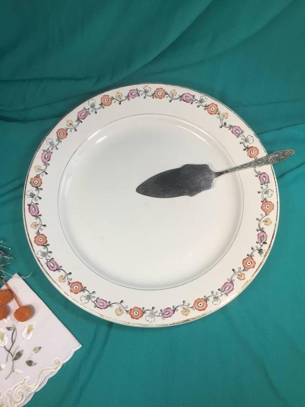 Большое керамическое блюдо белое с цветочным кантом Буды Ø-365 мм. СССР 60-е гг. Н4001 для торта, пирога Большое белое керамическое блюдо украшено по краю цветочным кантом и золотыми полосками. Прекрасный предмет для сервировки сола. Подходит для подачи торта, пирога, закусок и прочего. Изготовленно на Будянском фаянсовом заводе - Серп и Молот (Буды), согласно клейму на донной части это период 1957-1965 гг. Большое блюдо, размер в диаметре 365 мм. Прекрасный экземпляр в коллекцию и для ценителей винтажной посуды. Сохранность отличная, мелких пару точек долива глазури, показано на последнем фото. Смотрите другие мои объявления, для поиска воспользуйтесь фильтрами♥️ Спасибо за покупки 🎁 :). Отправка Новой Почтой или Укрпочтой - доставка безопасной сделкой или - по полной или минимальной предоплате . Пересылаю