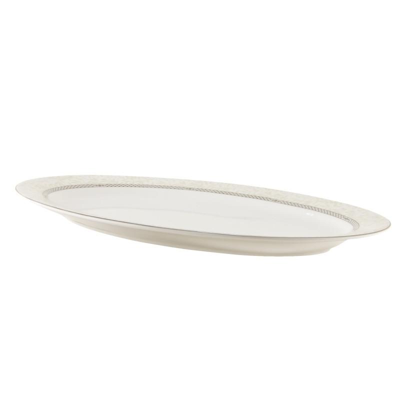 Блюдо з рослинним орнаментом по краю. Довжина - 360 мм. Блюдо виготовлено з кістяної порцеляни. Кістяний фарфор в Європі називали королівським або білим золотом. У Китаї, звідки він родом, за благородну тонкість його називали яєчною шкаралупою. Секрет виробництва зберігали як зіницю ока. Для кістяної порцеляни характерна особлива білосніжність, витончена тонкість і благородний звук при постукуванні. Тепер можна розкрити віковий секрет: всіма цими властивостями фарфор наділяє кісткове борошно тваринного походження. Завдяки натуральній сировині, вироби з кістяної порцеляни абсолютно безпечні для здоров'я. Сервіровка святкового столу неможлива без посуду, на якому подають холодні і гарячі закуски, дичину. Існує особливий порядок подачі закусок. Спочатку подають рибу, потім відварне м'ясо, холодець, фаршироване, смажене, копченості та ковбасу, птицю і дичину. Також на блюді подають плов.
