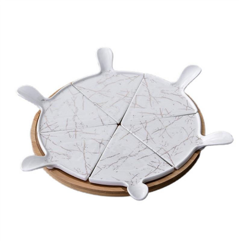 Блюдо для пиццы керамическое на вращающейся подставке, белый мрамор Блюдо для пиццы диаметром 28 см – отличный вариант для сервировки стола. Блюдо имеет вращающуюся бамбуковую подставку, керамическая тарелка дает возможность без проблем разделить пиццу на 6 равных частей для порционной подачи. Такая посуда идеально подойдет также для разных видов выпечки, среди которых торты, открытые и закрытые пироги, кексы, запеканки и многое другое. Блюдо изготовлено из качественных материалов, тарелку можно мыть в посудомоечной машине, а уход за бамбуковой подставкой не составляет труда. Достаточно после использования протереть ее мягкой влажной тканью без использования абразивных моющих средств. Характеристики: - Материал: керамика - Высота: 4 см - Диаметр: 28 см