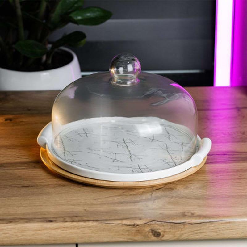 Елегантна тортівниця для торта стане справжньою окрасою вашого столу. Виготовлена з високоякісної кераміки з розкішним мармуровим візерунком, що поєднує золото на білому тлі, вона випромінює витонченість і вишуканість. Кругла форма підставки забезпечує достатньо місця для розміщення навіть великих тортів та десертів. Скляна кришка, яка йде в комплекті, надійно захищає ваші кулінарні шедеври від зовнішніх впливів, зберігаючи їхню свіжість та смак. Прозоре скло кришки дозволяє милуватися красою десерту, не знімаючи кришки, що додає елементу загадковості та очікування на кожному святковому заході. Дана тортівниця підходить для миття в посудомийній машині, що значно полегшує догляд за нею, зберігаючи її бездоганний вигляд навіть після багаторазового використання. Характеристики: Матеріал кришки: Скло Матеріал тортівниці: Кераміка Матеріал підставки: Бамбук Висота: 19 см Діаметр: 29 см