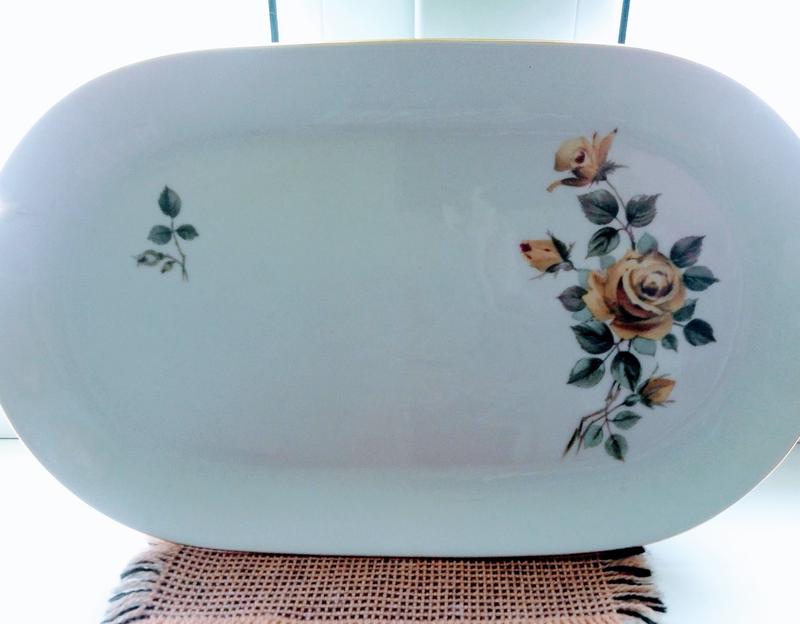 Хозяйствам овальное большое блюдо к вашей выпечке! Замечательный сервировочный фарфор с ГДР с принтом "чайная роза",размер:330мм*200мм. Е маленький мягкий скол на бортике изделия, см. фото.