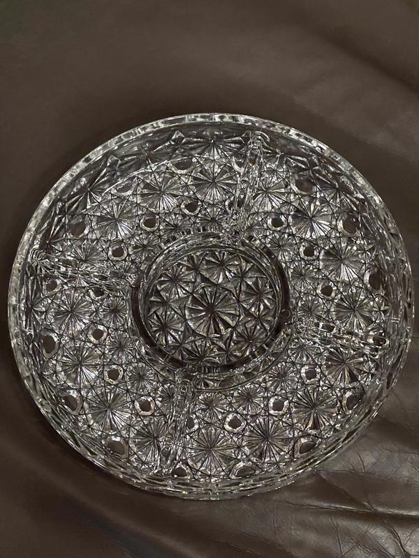 Скляне блюдо на 5 відділень Вишукане скляне блюдо ручної роботи з геометричним візерунком у стилі “Diamond Star”. Ідеально підходить для подачі фруктів, закусок, соусів або солодощів. Прекрасно переливається на світлі, створюючи ефект кришталю. Характеристики: • Без клейма (імовірно, старовинне пресоване скло) • Вага: 1,3 кг • Висота: 4,0 см • Діаметр: 25 см • 5 секцій для різних продуктів • Стан: чудовий, без тріщин чи сколів Цінність: Масивне, важке скло з красивим оптичним блиском — прикраса для святкового столу або колекційна річ для любителів вінтажу.