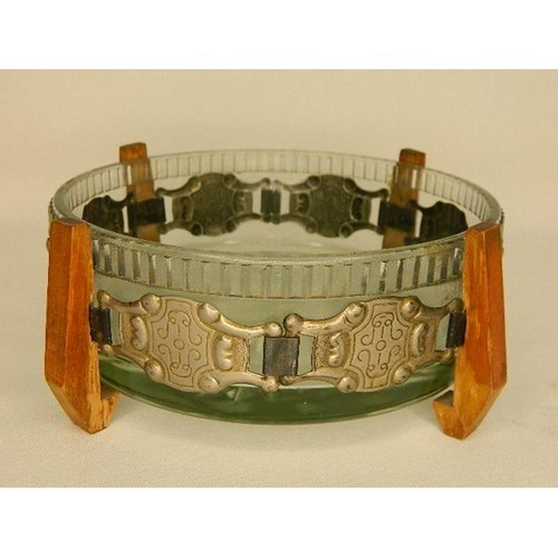 Конфетница круглая, стекло, дерево, металл. Диаметр 15 см, высота- 6 см.