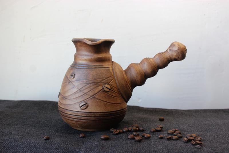 Турка ручной работы для заваривания кофе. Напиток, приготовленный в керамической турке, особый, крепкий и ароматный. Использовать на электроплитах и на газовых через рассеиватель, запрещается ставить турку на открытом пламени. Размеры: 21 * 15 * 12 см, объем 0.5 л.