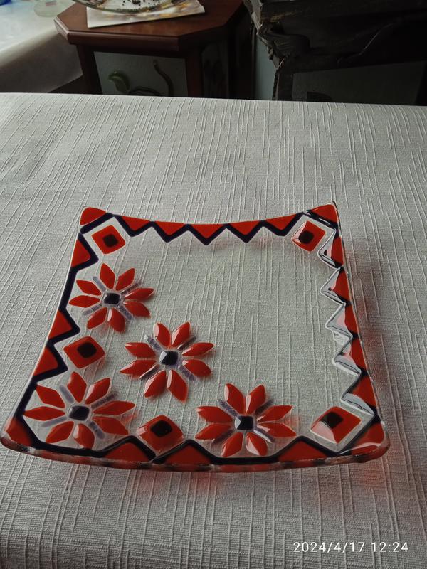 ,Блюдо ручной работы, выполненное из стекла по витражной технологии фьюзинг ( горячее спекание). Блюдо можно использовать для сервировки стола, для фруктов, конфет, печенья и др. Дизайн - украинский орнамент в красных и черных цветах. Размер 220*220 мм. Фьюзинговые изделия - это всегда красиво и современно, они притягивают взгляд к себе своей индивидуальностью и магией цветов, искрящихся и переливающихся под лучами света.Такое блюдо станет украшением на вашей кухне а также может быть хорошим подарком женщине, которая любит эксклюзивные вещи.