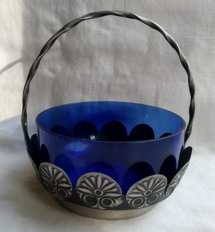 Винтажная мельхиоровая конфетница кобальтовое стекло.