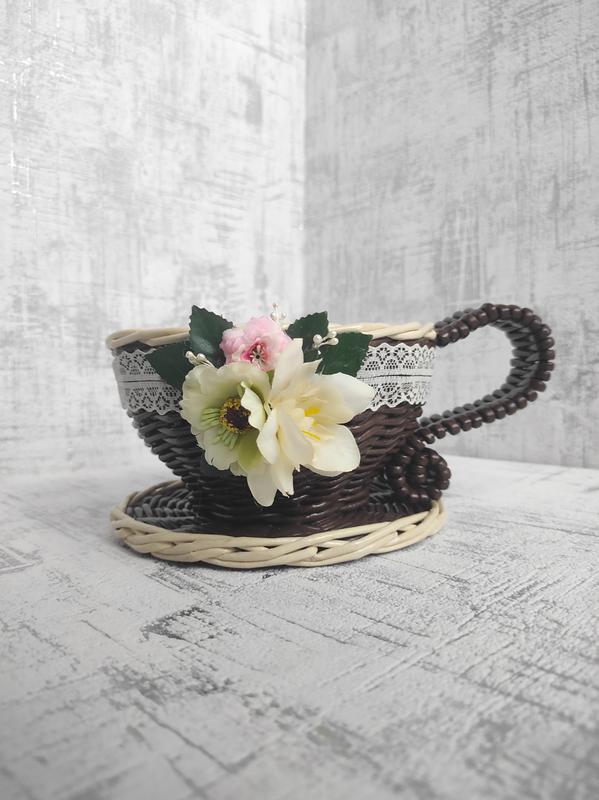 Чашка, конфета, пиалка изготовлена из бумажной лозы. Обработанная акриловым лаком, не боится влаги. При легком загрязнении достаточно протереть сухой кисточкой. Если загрязнение сильнее, можно промыть под проточной теплой водой, но не горячей, не используя абразивов Размер: диаметр блюдца - 16см, диаметр верха чашки - 15см, высота - 9 см.