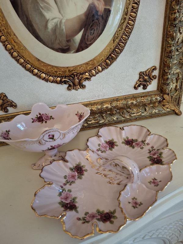 The Czech porcelain Чеська порцеляна у рожевому кольорі з ручним золотим оздобленням яке додає розкоші предметам Ваза на ніжці для фруктів,печива або цукерок (в 12см,ш18см) Менажниця з красивою вигнутою ручкою (29*19cm) Без сколів і інших пошкоджень,стан ідеальний
