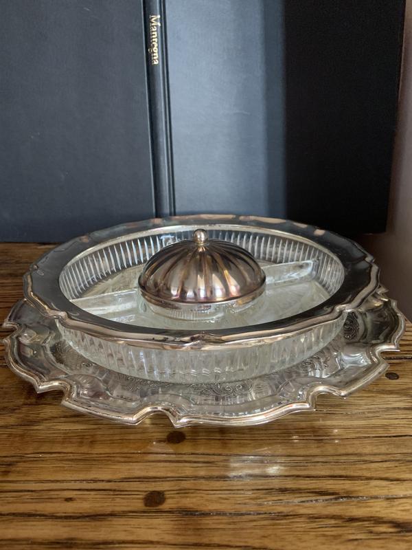 Велика кришталева менажниця на 4- ре відділення і в середини- для оливок. Окремо піднос. В гарному стани, все ціле, є сліди окислення на ободі блюда, та підноси. Піднос-31 см, блюдо-26 см